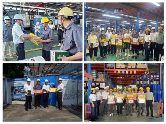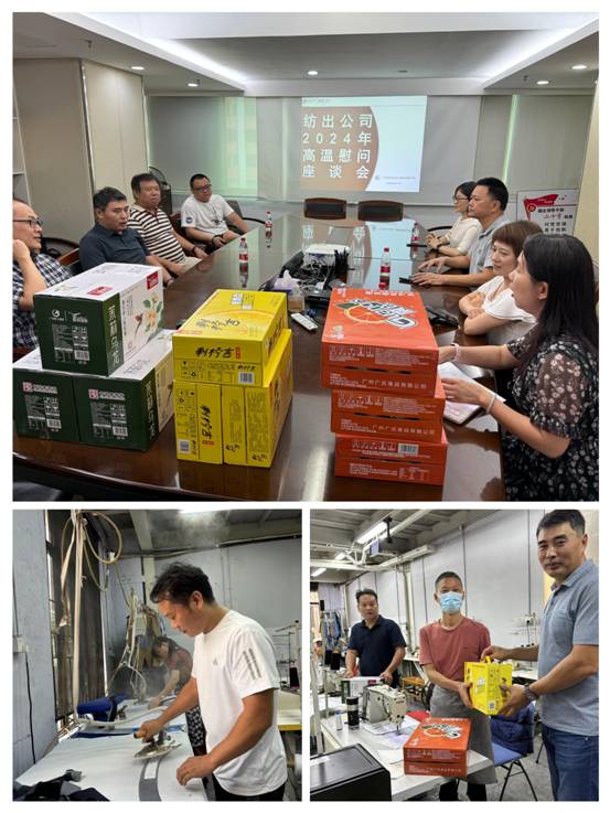 公司常务副总经理葛伟志带队到利工民仓库,为奋战在高温仓库下的员工们送去鼓劲和关爱;党委副书记、工会主席丘海澜先后来到科贸园项目工地和广纺联公司户外停车场,查看各类高温应急物资储备,为项目施工人员和执勤保安队送去关心与慰问;纪委书记肖冀辉走进广德饭堂和户外维修部,点赞他们在岗位上默默奉献;副总经理关勇组织高温慰问座谈会,收集纺出公司司机和版房工的献言献策;副总经理林哲浩赶往从化洛民公司、炜鸿工厂和智造大厦工程项目部,在炎热下和他们并肩作站,严格要求厂区认真贯彻防暑降温及错峰施工措施,为工人休息创造良好的工作环境。